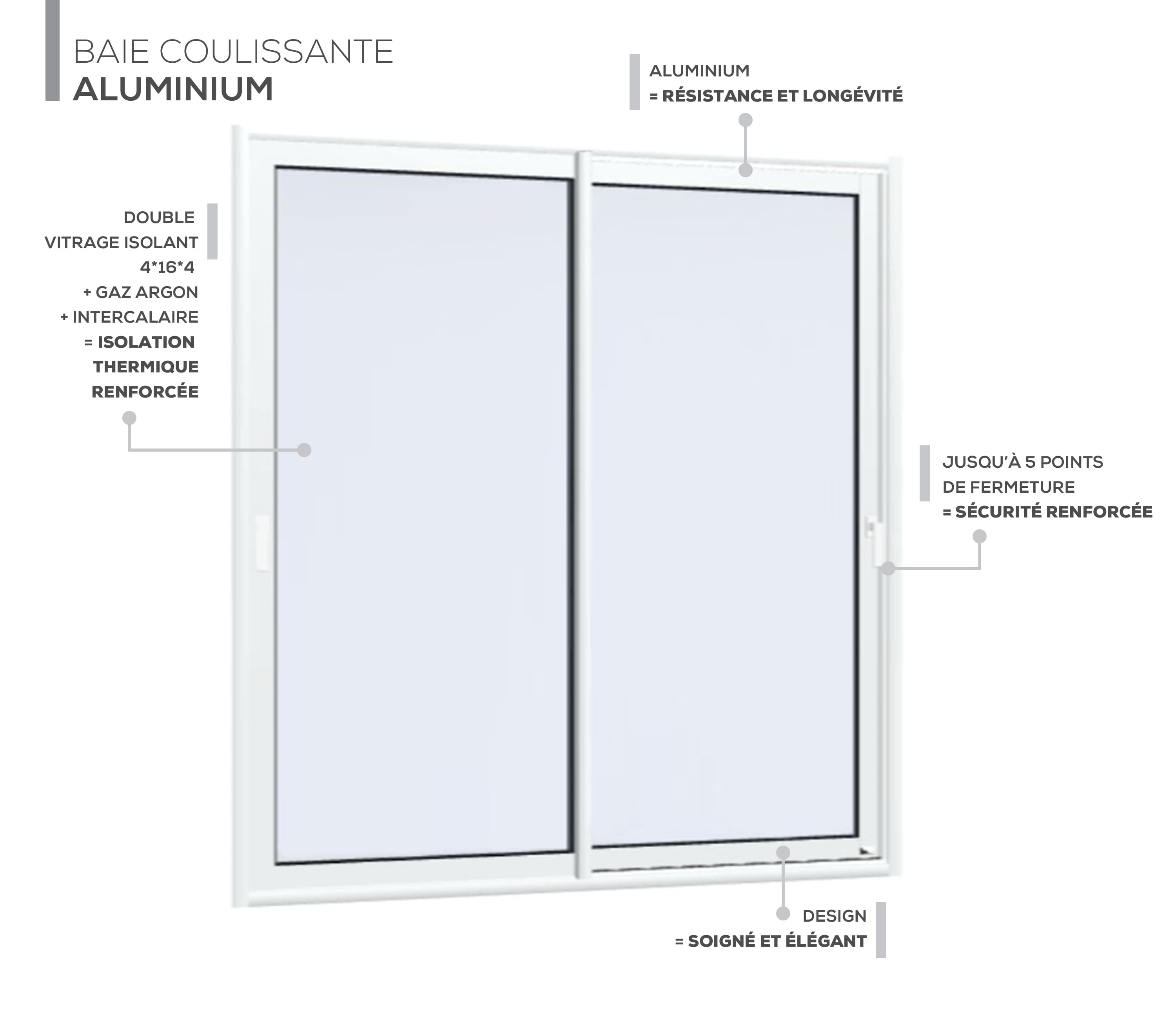 Idéale pour une utilisation dans les projets de construction neuve ou de rénovation, cette baie coulissante est conçue pour offrir une solution esthétique, durable et performante, même dans des conditions climatiques exigeantes. Optimisez l'esthétique et la performance de votre espace avec notre baie coulissante en aluminium thermolaqué, conçue pour répondre aux exigences les plus strictes en matière de construction.