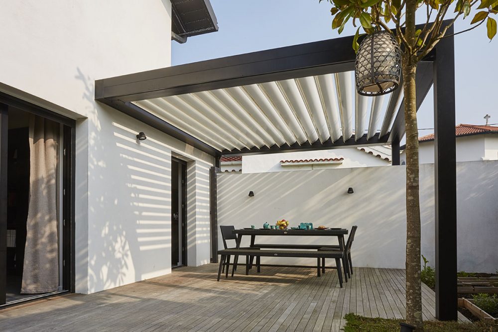 Pour encore plus jouer sur la lumière ou l’ombre, il existe un type de pergola dotée de lames orientables rétractables.