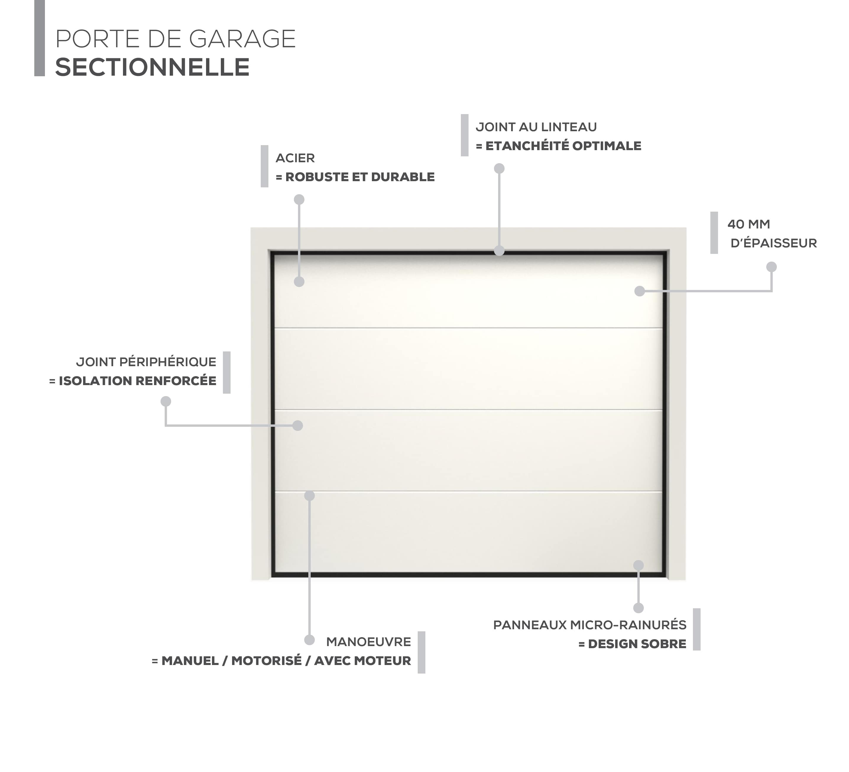 Cette porte est idéale pour les garages résidentiels, offrant une combinaison parfaite de sécurité, d’efficacité énergétique et d’esthétique.