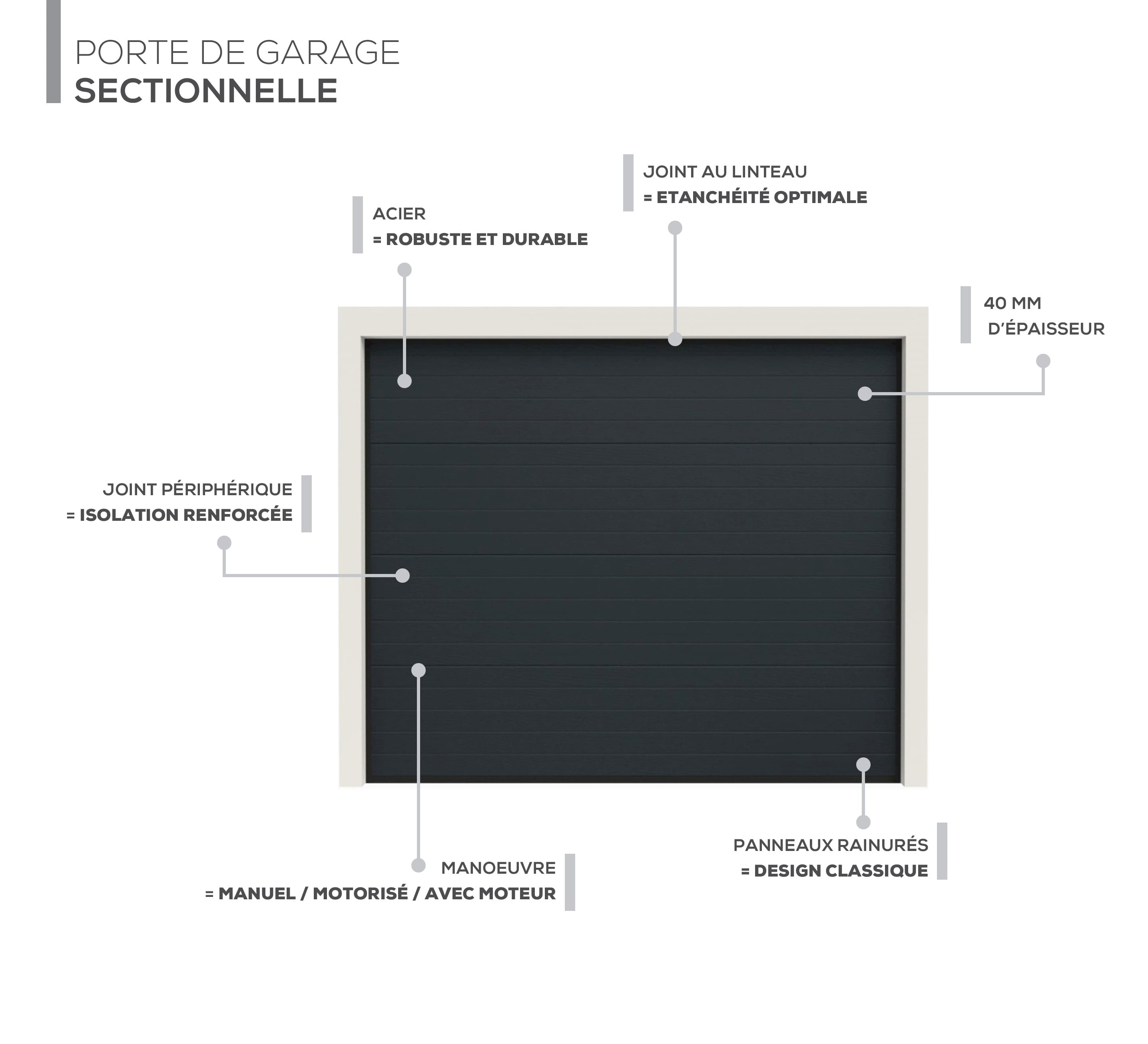 Découvrez notre porte de garage sectionnelle motorisée, conçue pour offrir une isolation thermique et une grande robustesse. Idéale pour tout type de garage, elle combine fonctionnalité et esthétique moderne.