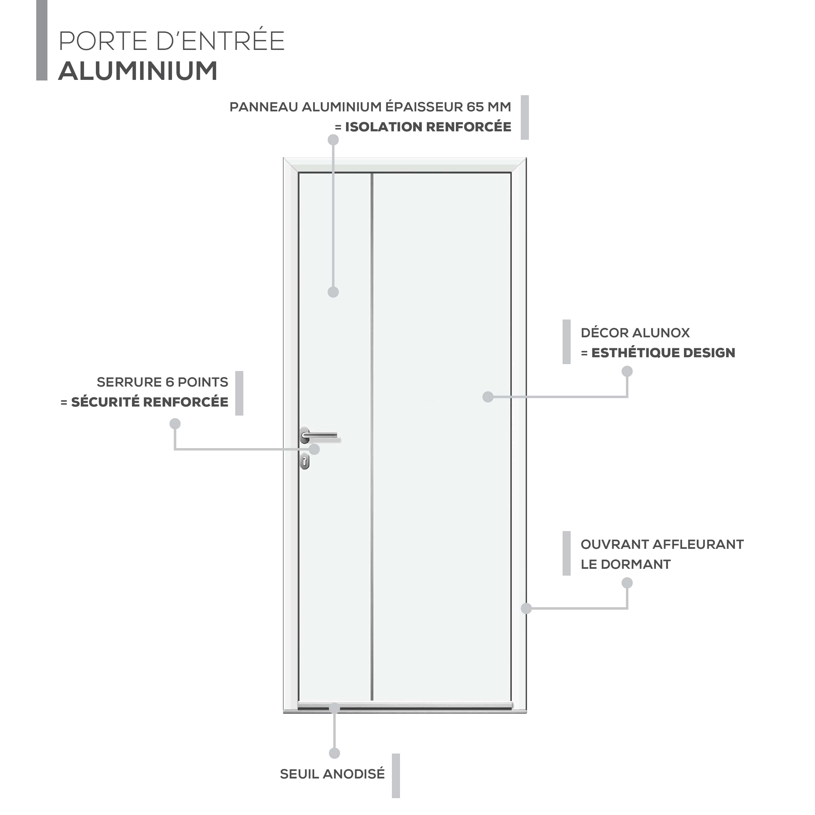 - Matériau : Menuiserie en aluminium, avec une isolation renforcée de 65mm d'épaisseur.