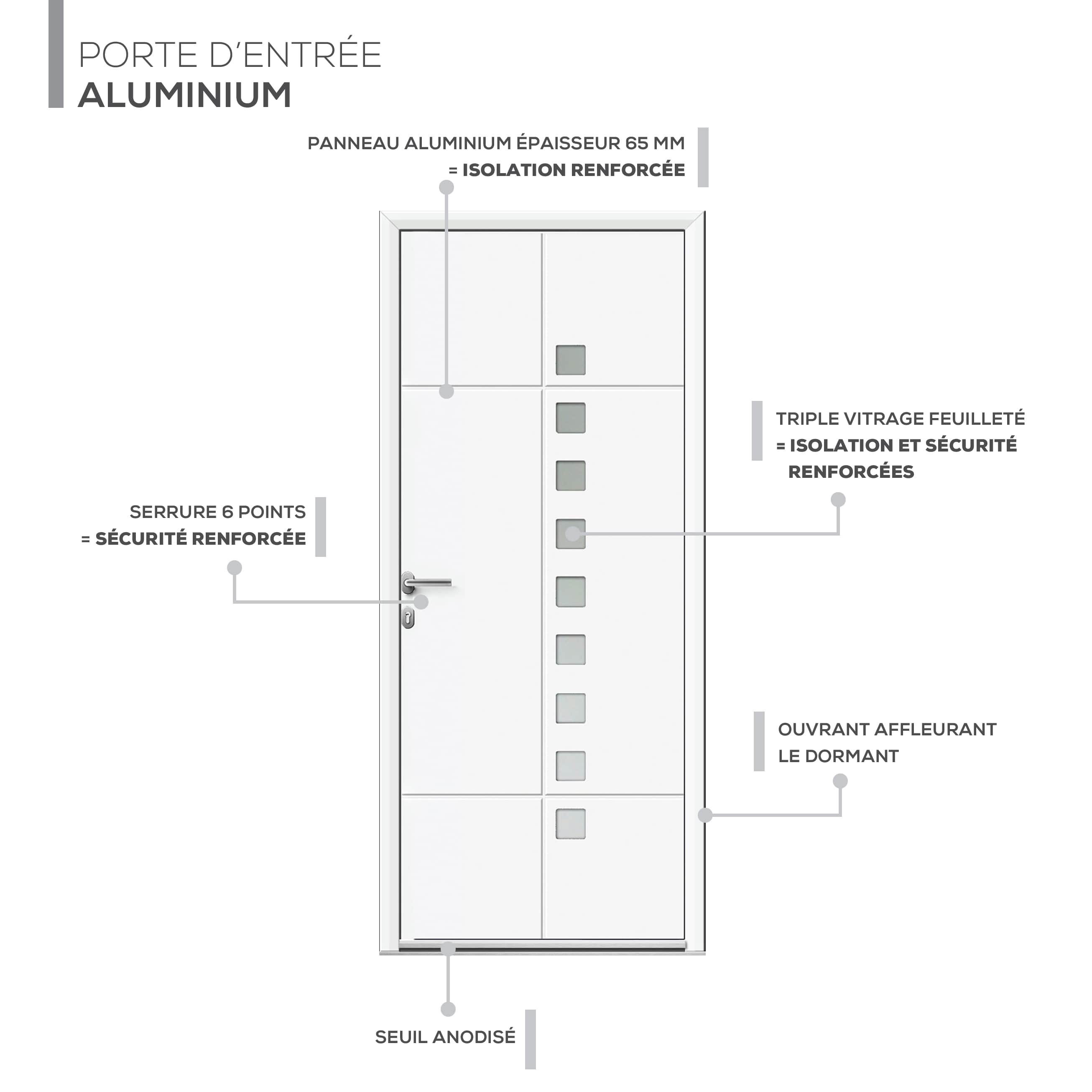 - Matériau : Aluminium avec une isolation renforcée de 65mm pour une efficacité thermique optimale.