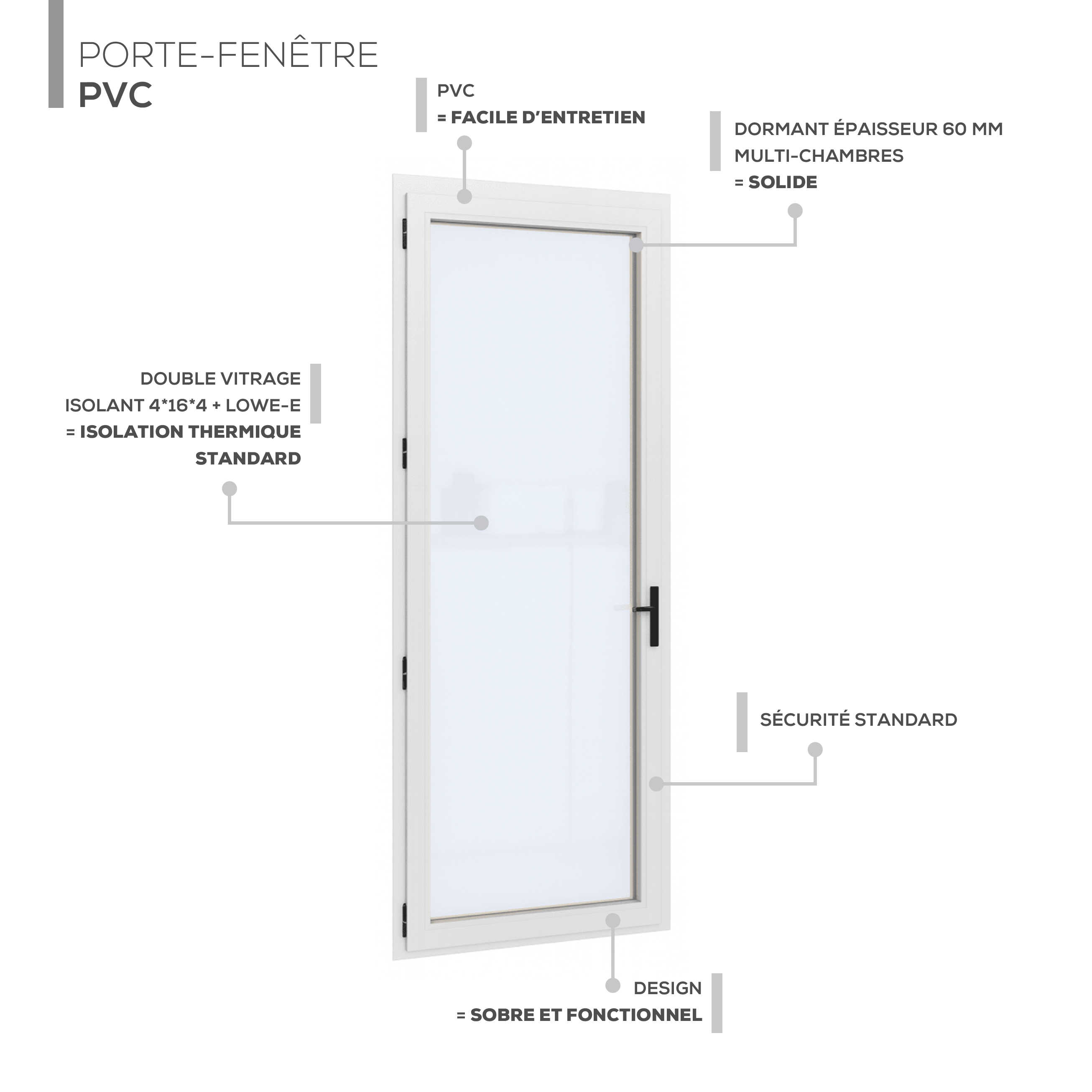 Idéale pour les nouvelles constructions ou les projets de rénovation, cette porte-fenêtre en PVC s’intègre parfaitement aux maisons individuelles, appartements et autres types de logements. Alliez performance et esthétique, notre porte-fenêtre PVC est une solution pratique et économique pour votre espace de vie.