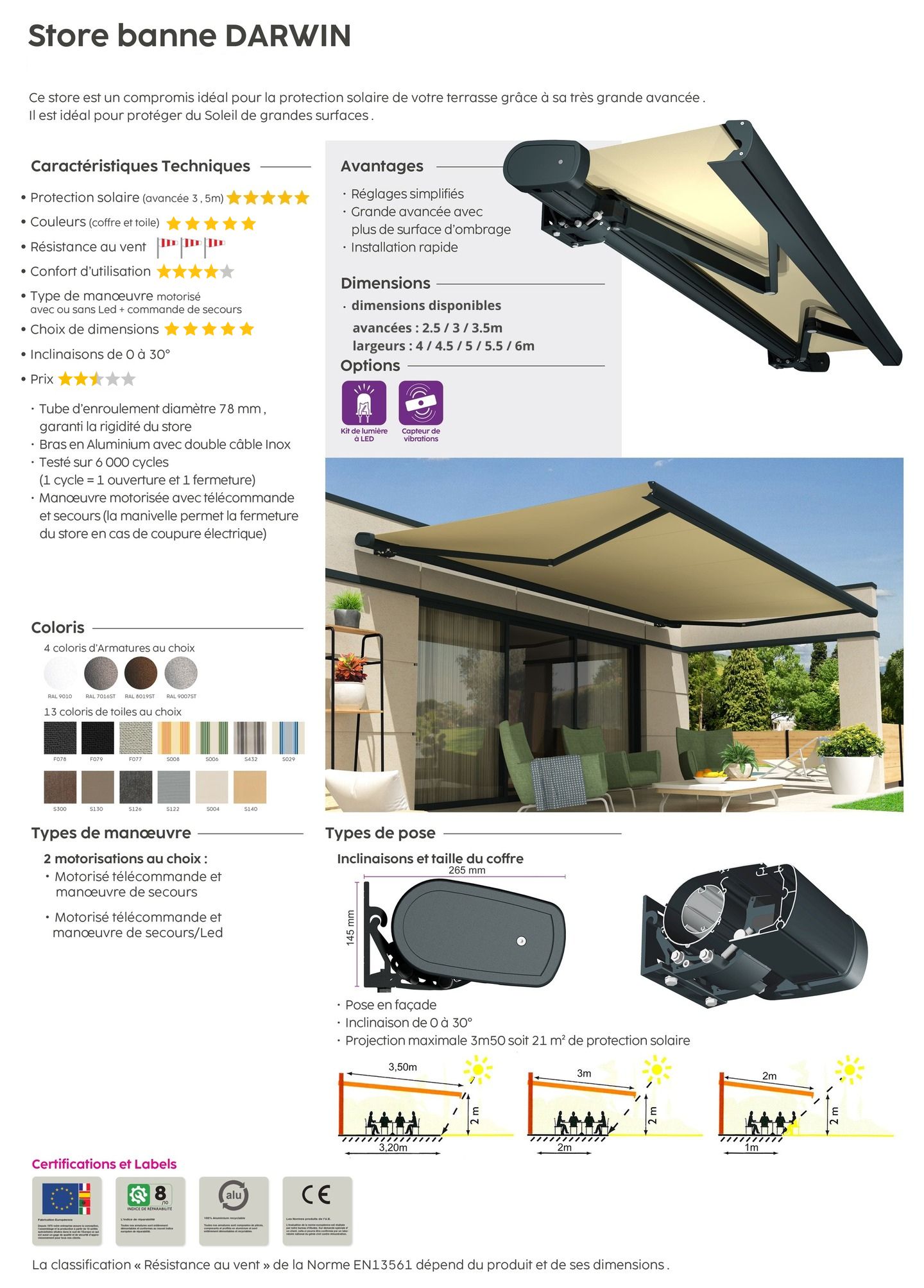 - Manœuvre : Système motorisé avec télécommande pour une utilisation facile et confortable. Équipé d'une manivelle de secours permettant de fermer le store en cas de coupure électrique.