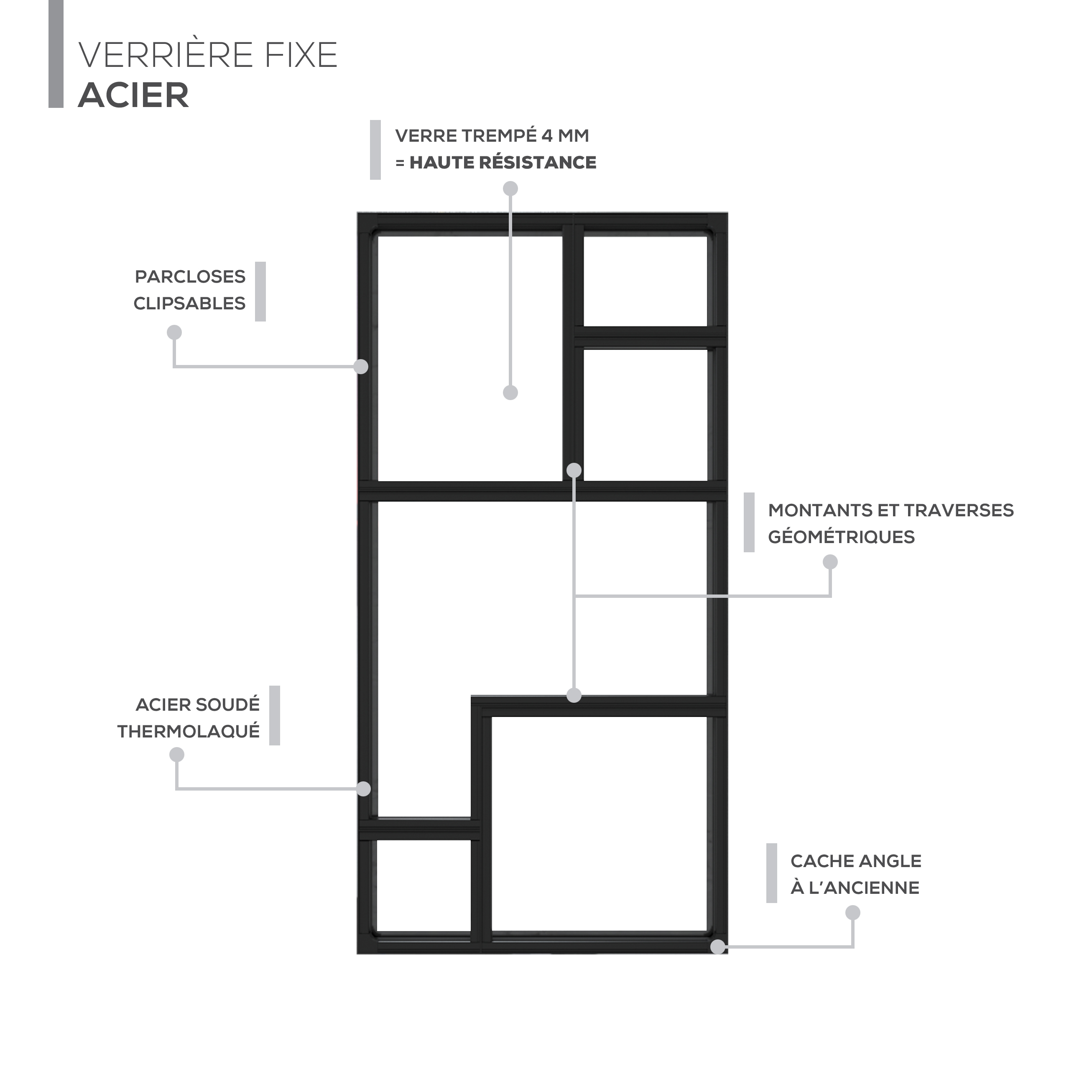 Avec son design Déstructuré, cette verrière fixe 1 vantail en acier casse les codes classiques : multiples traverses et montants s’entrecroisent pour composer une trame graphique originale, presque artistique. Chaque ligne crée du rythme et du relief, pour une séparation qui devient un véritable élément déco.