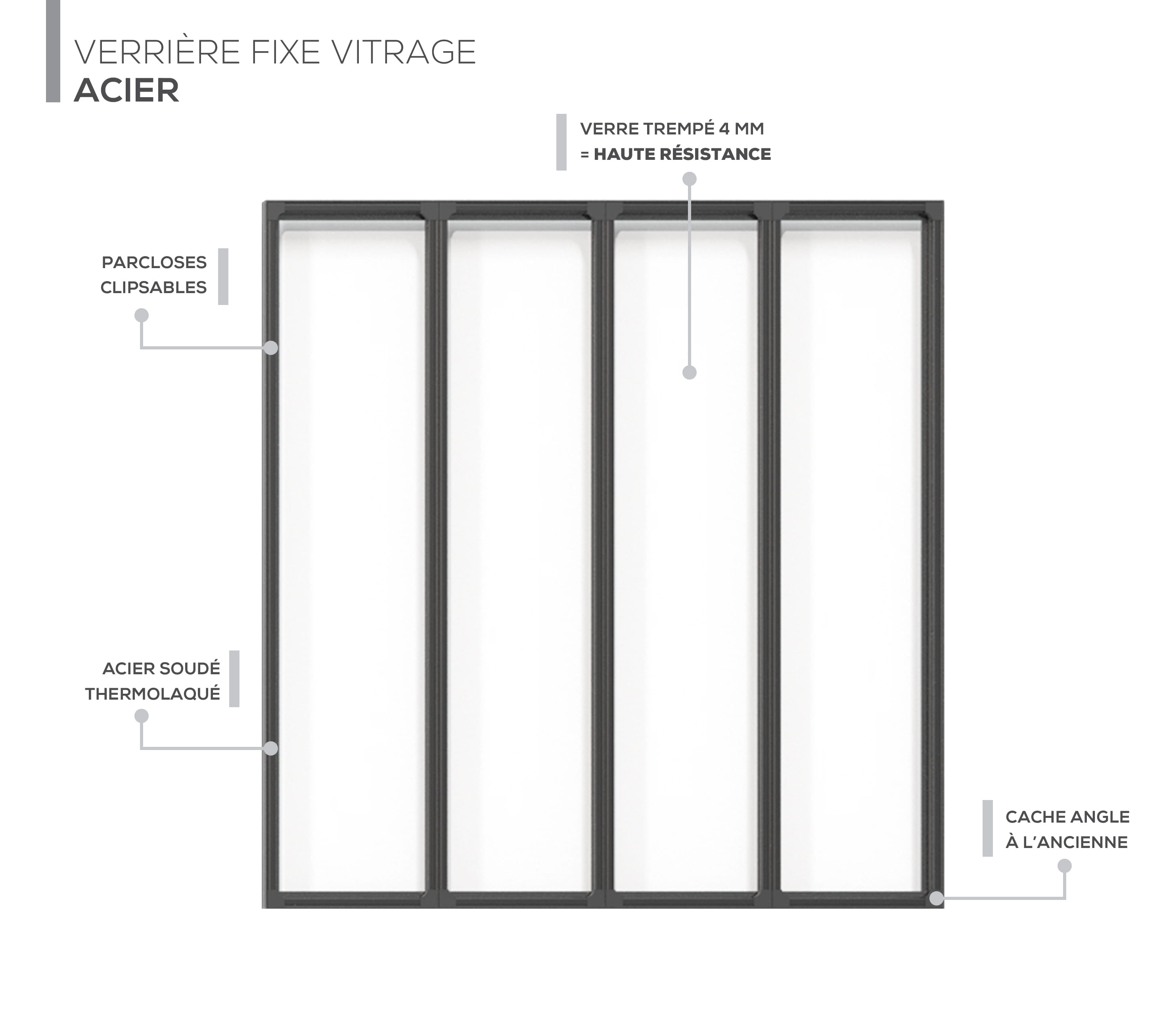 Avec 4 vitrages séparés par des montants réguliers, cette verrière fixe en acier renforce la sensation d’équilibre et de symétrie, tout en restant fidèle au design Traditionnel. La trame devient plus lisible et apporte une finition très soignée : un dessin net, rassurant, qui s’intègre facilement dans tous les styles d’intérieur, du plus classique au plus contemporain.