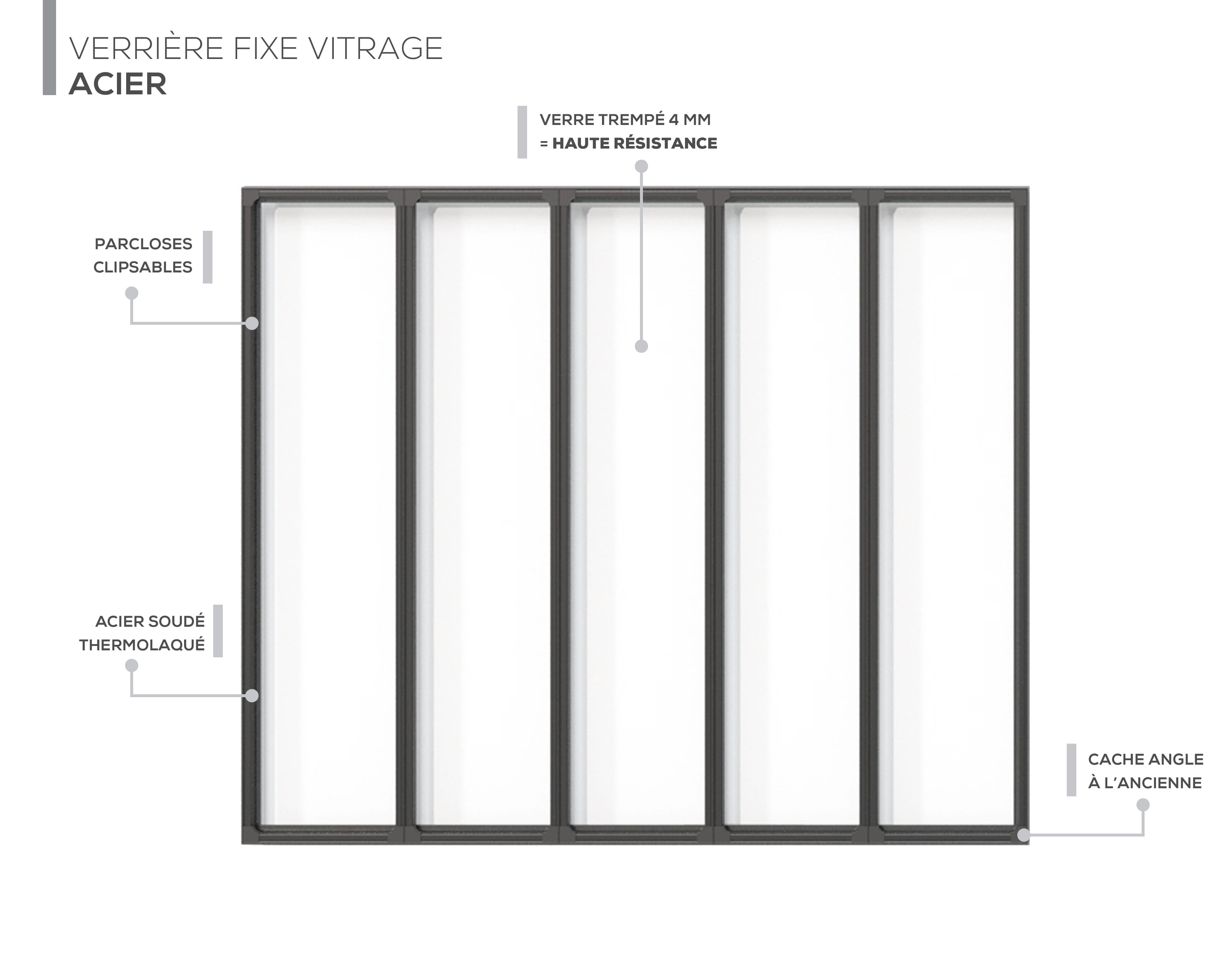 En version 5 vitrages, cette verrière fixe en acier gagne en caractère grâce à une trame plus rythmée. Les montants multiplient les découpes et créent une signature graphique plus présente, tout en conservant l’essence du design Traditionnel : des lignes simples, une lecture claire, et un rendu intemporel.